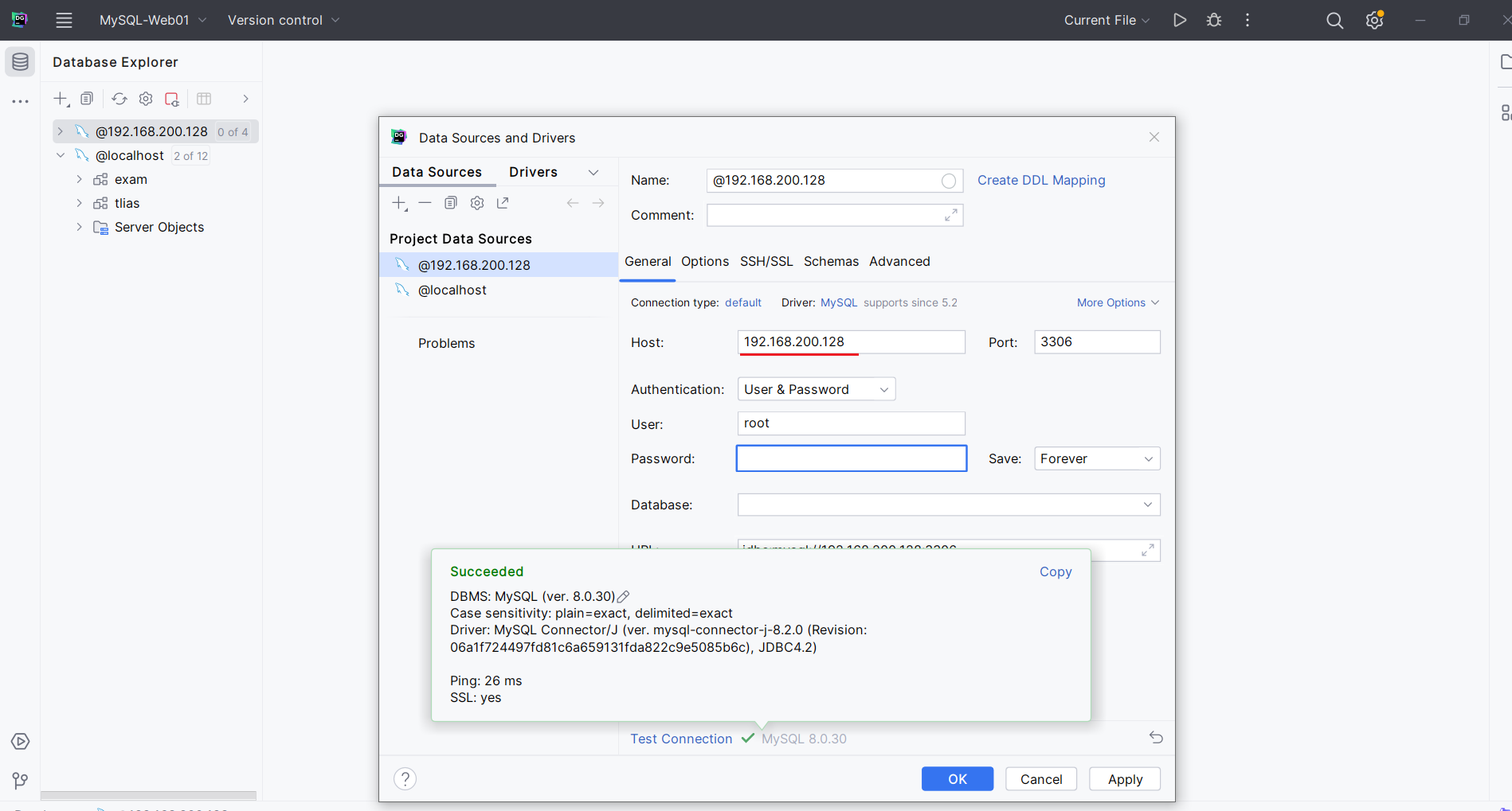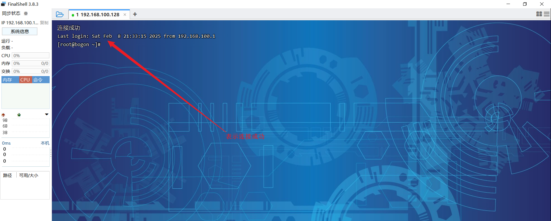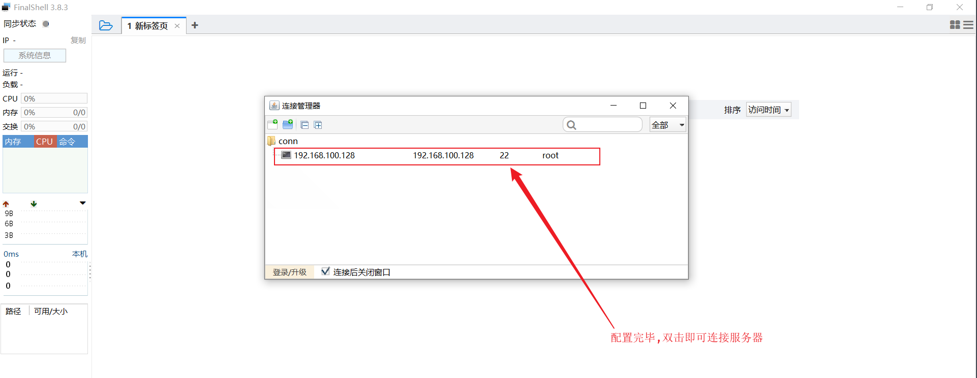- 连接服务器,输入服务器的信息,IP 固定的:192.168.100.128,用户名:root,密码:1234