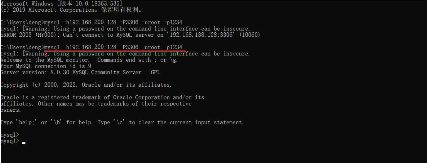 关闭掉 linux 系统的防火墙之后,我们就可以打开 windows 上的命令行,通过 mysql 的客户端(命令行/图形化界面)来连接远程 linux 上安装的 MySQL 数据库了。