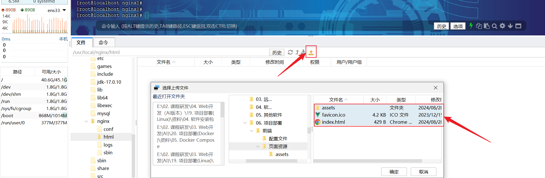 2). 将资料中提供的 "资料/06. 项目部署/前端/页面资源" 目录下的静态资源文件,全部上传到 nginx 安装目录下的 html 目录中.