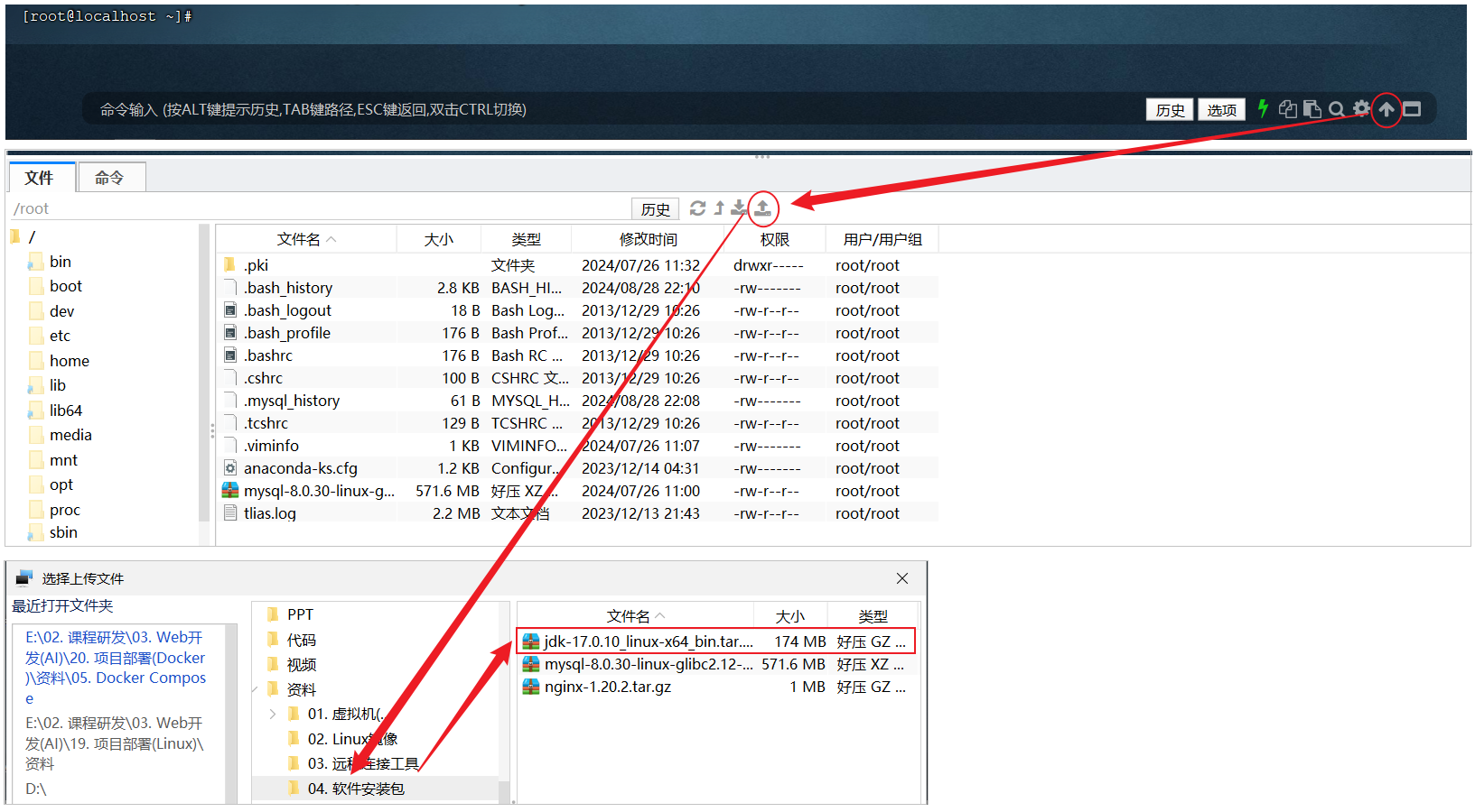 2). 在 Linux 服务器上创建一个目录,将 jar 包上传到服务器 。