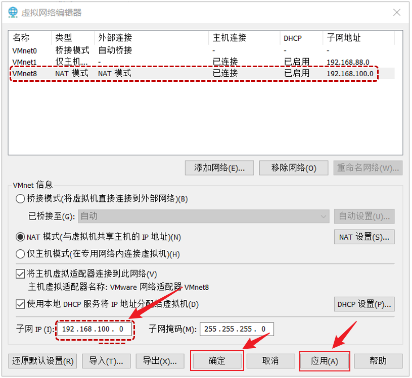 设置子网 IP 为 192.168.100.0,然后选择 应用 -> 确定。