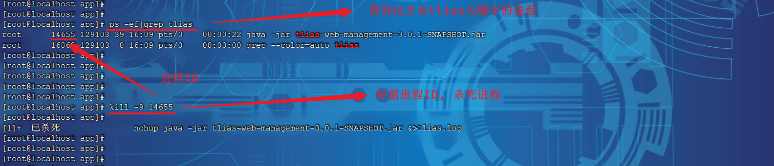 #查看服务的进程信息 ps -ef|grep tlias #杀掉进程 kill -9 xxxxx